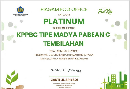 Upaya tersebut akhirnya berbuah manis dengan diraihnya Piagam Eco Office kategori Platinum dari Kementerian Keuangan Republik Indonesia.