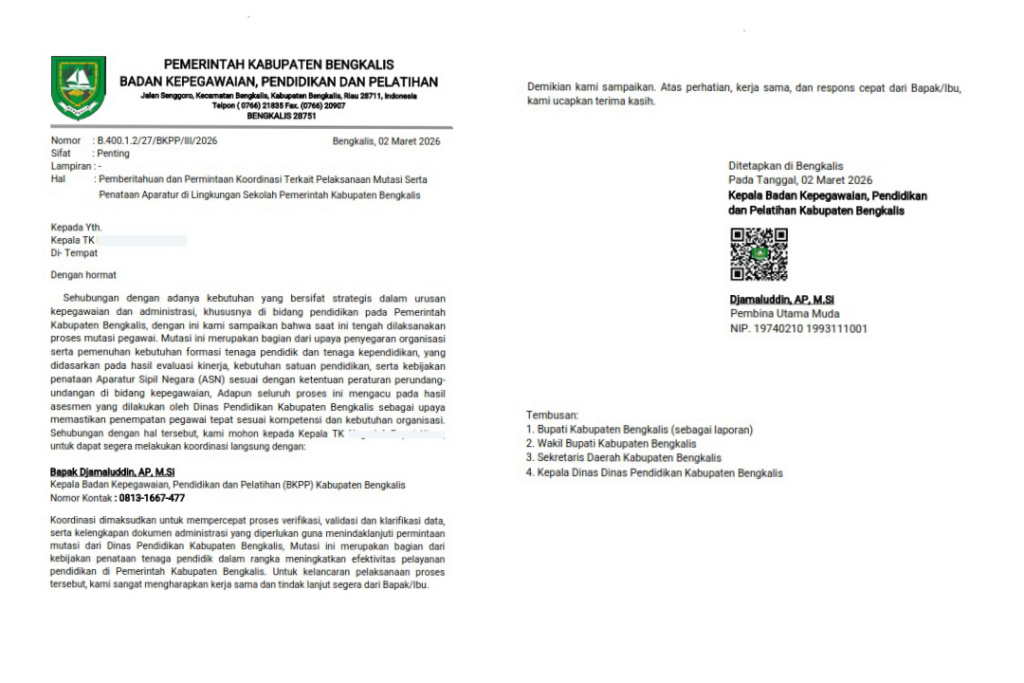 Waspadai Penipu! Surat Palsu BKPP Bengkalis Beredar Permintaan Data Mutasi ASN TK Hingga SMP