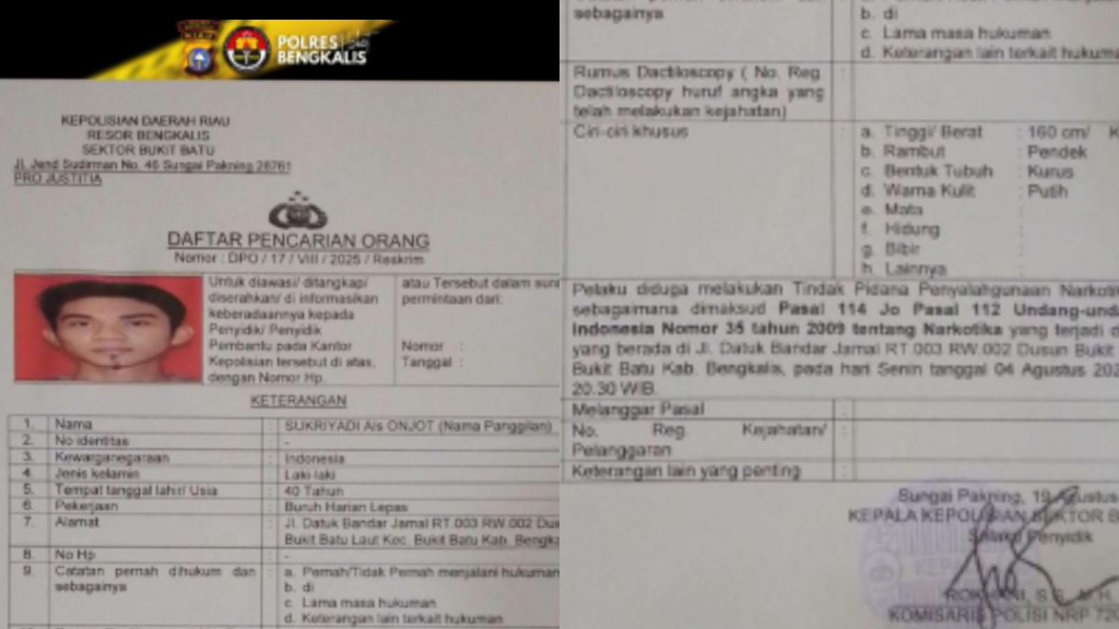 | Minggu, 22 Maret 2026 Sukriyadi Onjot, Polisi Buru Buronan Kasus Peredaran Perusak Saraf di Bukit Batu Bengkalis
