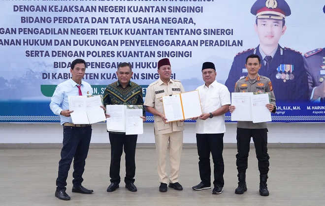 Penegasan tersebut disampaikannya dalam acara Penandatanganan Perjanjian Kerja Sama antara Pemerintah Kabupaten Kuantan Singingi bersama Kejaksaan Negeri Kuantan Singingi, Polres Kuantan Singingi, dan Pengadilan Negeri Teluk Kuantan, Senin (3/3/2026) petang.