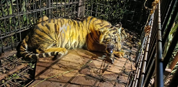 ternak yang dimangsa sebagai umpan. Pada malam harinya sekitar pukul 21.00 WIB, saat tim melakukan monitoring, Harimau Sumatera tersebut terpantau telah masuk ke dalam kandang jebak sehingga berhasil diamankan. Selanjutnya pada Rabu, 11 Maret 2026 tim melakukan proses evakuasi dengan memindahkan satwa dari kandang jebak ke kandang angkut melalui prosedur pembiusan oleh tim dokter hewan dari Balai Besar KSDA Riau.