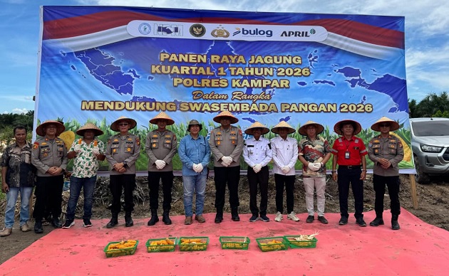 Riauterkini-KAMPAR – Upaya memperkuat ketahanan dan kemandirian pangan nasional kembali ditunjukkan melalui kegiatan panen raya jagung pipil kuartal I tahun 2026 yang dilaksanakan oleh Polres Kampar, didukung oleh PT Nusa Prima Makmur (NPM) dan PT Riau Andalan Pulp and Paper (RAPP), serta bekerja sama dengan Lembaga Pengelola Hutan Desa (LPHD) Rantau Kasih Bersatu.